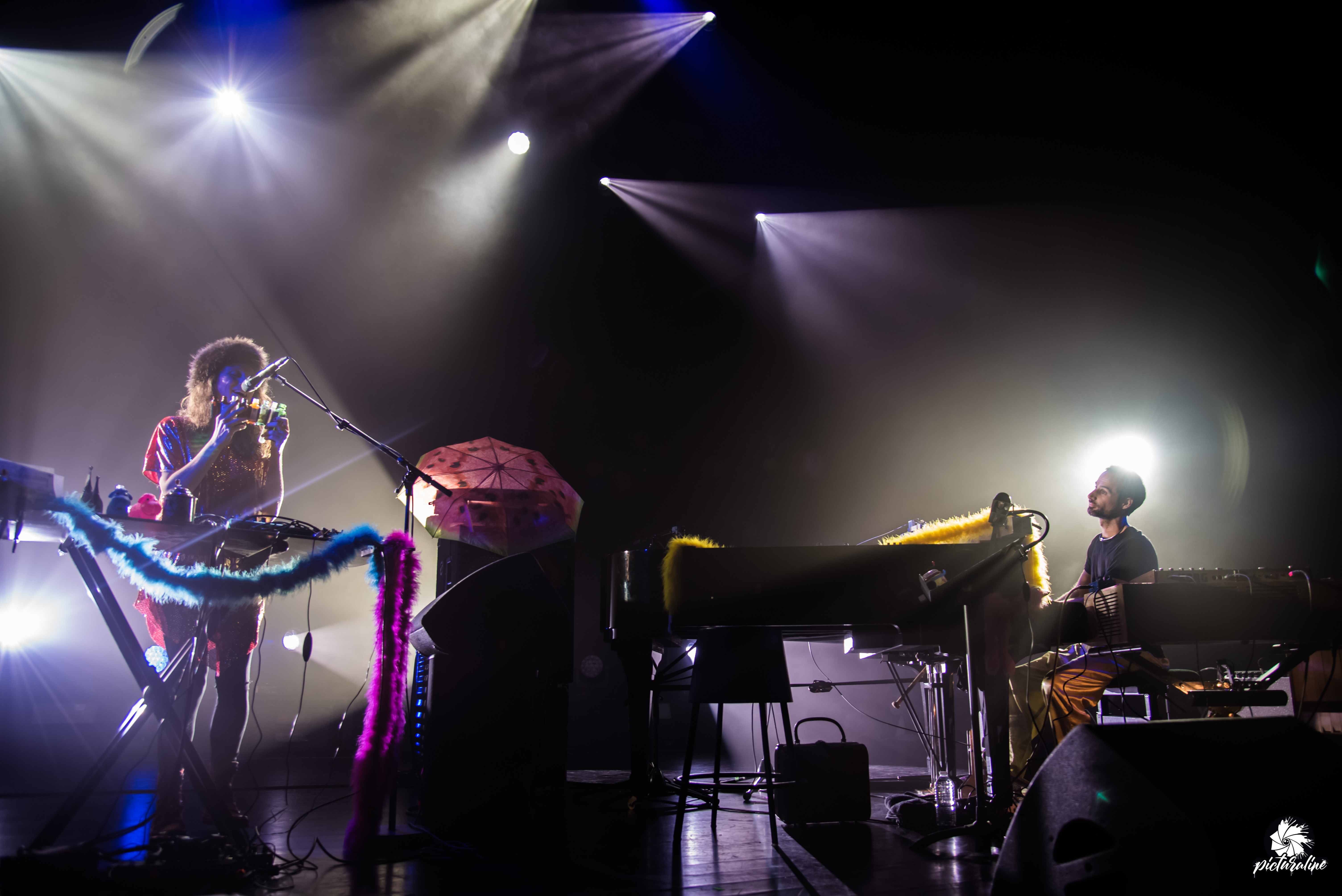 Au milieu de tout ça, il y a la joie de se surprendre à deux et d’amener le public à marcher sur la corde du funambule, en apnée devant les prises de risques, de quoi faire tomber le quatrième mur assez rapidement. Arthur Ower, en troisième homme, prend part à la création sonore pour installer le public dans un cocon, et la tâche n’est pas aisée au vu de la diversité décrite ci-avant. Elie joue des pieds et des mains, littéralement, Leïla de sa voix et de ses machines, petit à petit, les deux chercheur.euses trouvent leur son et conquièrent leur public.